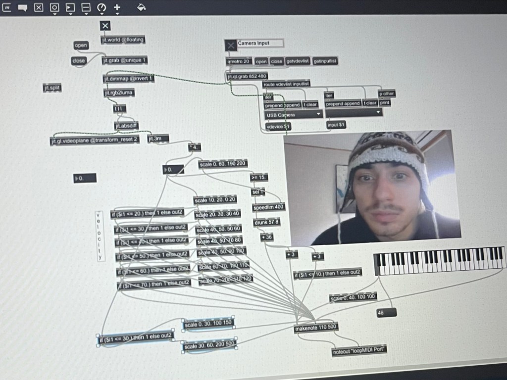 a patch i made in MAX/MSP to read, analyze and convert the differentiating pixels of one frame to another into midisignals. by using that we can play notes in realtime based on movement.