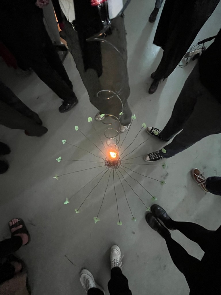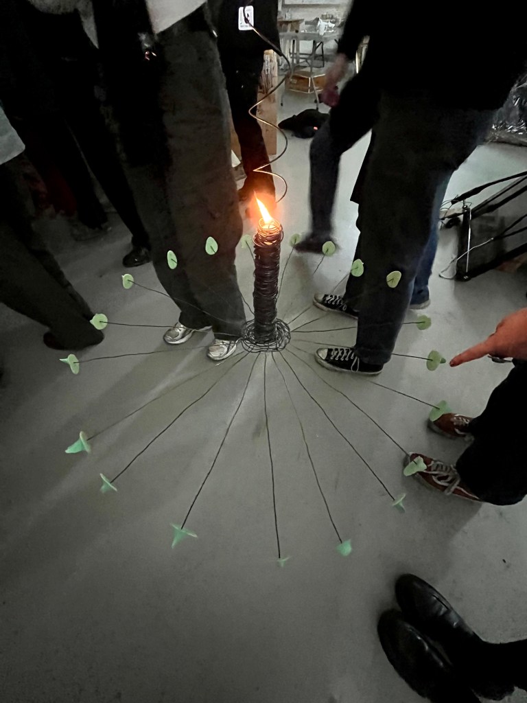 a spinning chandelier hanging from 5 meters in a spiral made of steel wires, a candle and 20 unique navels casted in silicone.